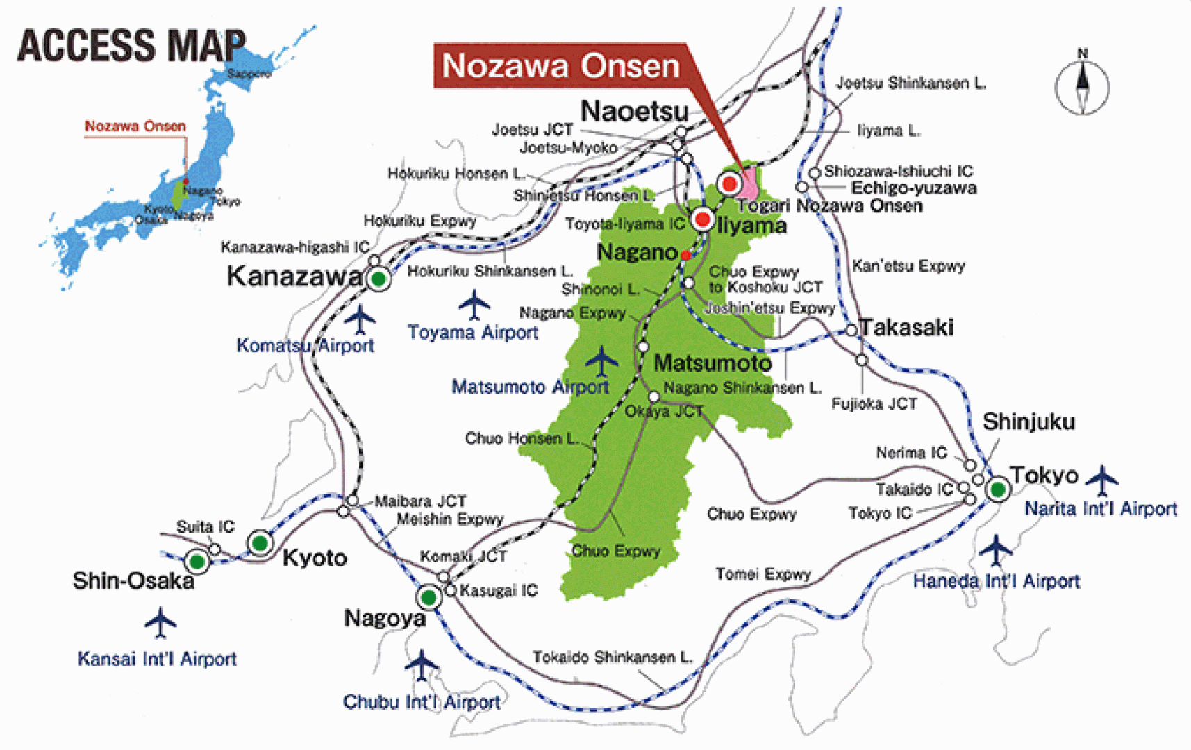 The highway network in Japan is extensive and efficient. Getting from all major centers to Nozawa Onsen is easy. The toyota iiyama interchange is the closest access point to Nozawa from the Joshin-etsu expressway. But be sure to let us know if you are arriving by car- free parking in Nozawa is very limited in winter. See https://en.driveplaza.com/ for route maps and tolls.