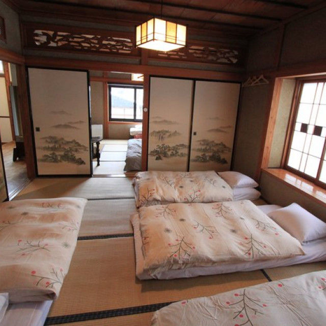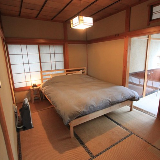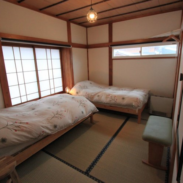 The second floor has 4 Japanese tatami rooms: A queen bedroom, a twin bed room and adjoining 8jo rooms with 2 low beds and futons and with large windows over-looking the main street, There is a toilet and vanity on this level too.
